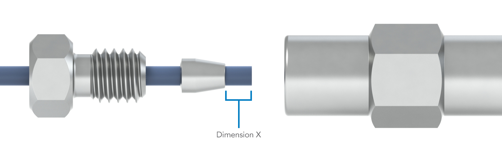 Take a zero dead-volume union, male nut, and ferrule from one manufacturer [Figure 1a]. Put the male nut and ferrule on a piece of 1/16″ OD stainless steel tubing. Insert the tubing, ferrule, and nut into the ZDV union. Be sure the tubing bottoms out in the union. Swage the ferrule onto the tubing by tightening the male nut finger tight, and then a 3/4 turn with a wrench. Now remove the male nut, ferrule, and tubing from the fitting. Measure the distance from the end of the ferrule to the end of the tubing [Figure 1b]. Let’s call this Dimension X.